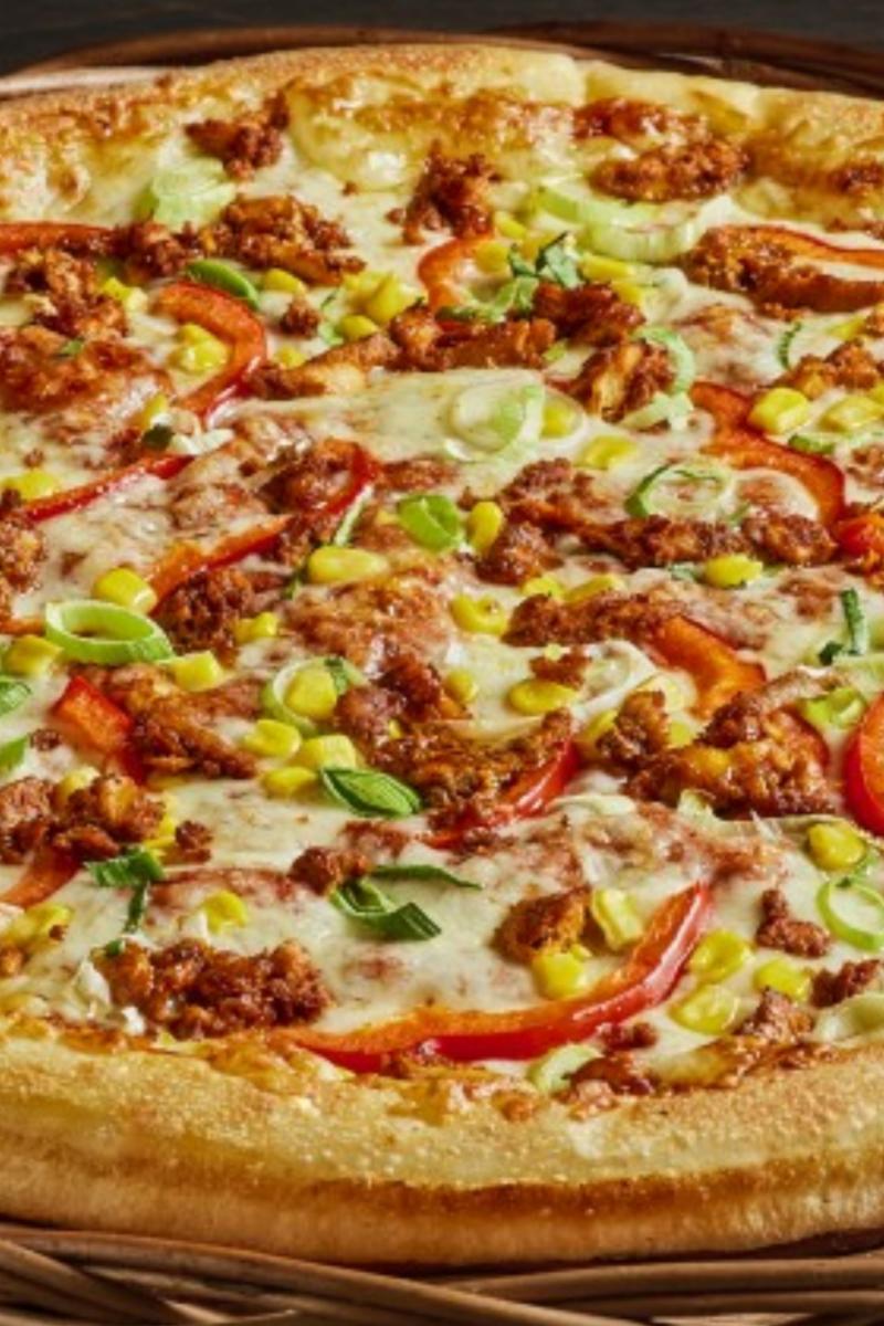 Pizza med marinert kylling, mais, purre og rød paprika.