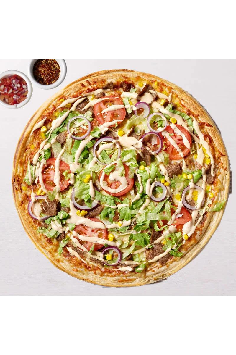 Peppes kebabpizza med dønerkjøtt. Toppes med salat, tomat, mais, rødløk og kebabdressing etter stek. Velg mellom mild eller sterk dressing