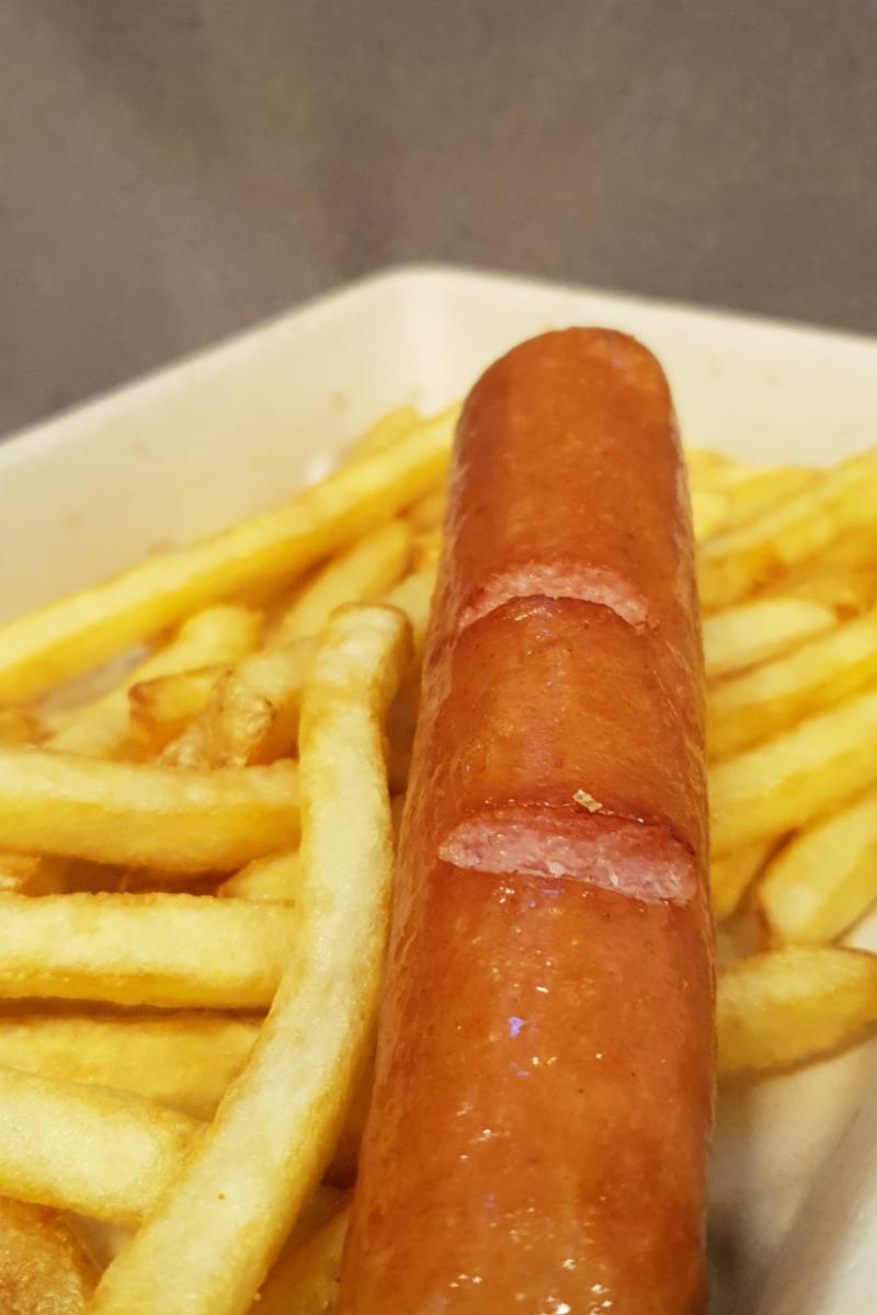 Frityrstekt pølse med pommes frites og juice.