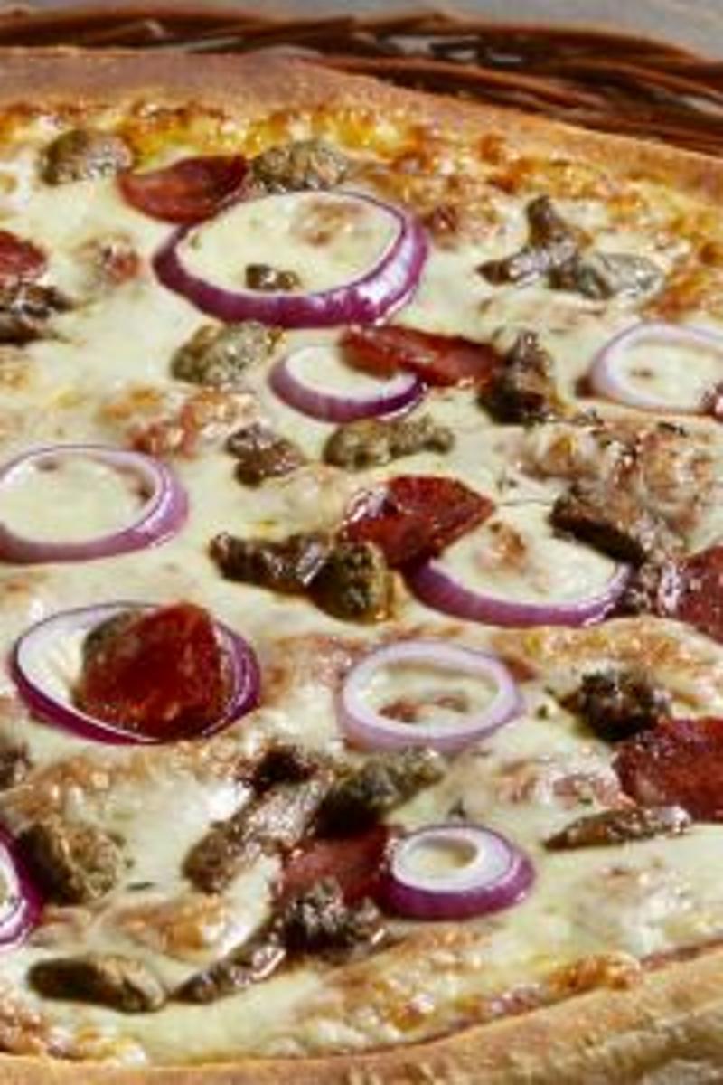 Pepperoni, hvitløkskrydrede kjøttboller, marinert biffkjøtt, rødløk og oregano.