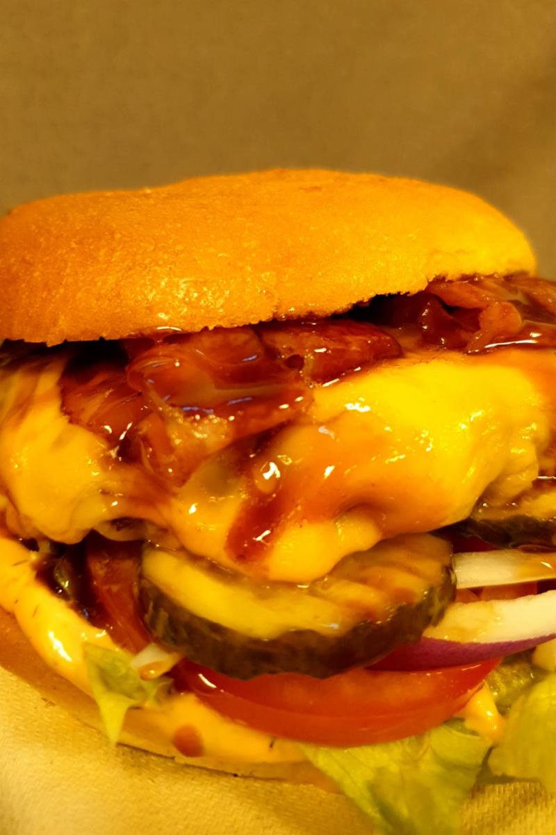 160gr eller 250gr burger med dressing, salat, rødløk, tomat og sylte agurk som toppes med cheddar ost, bacon og glaze.