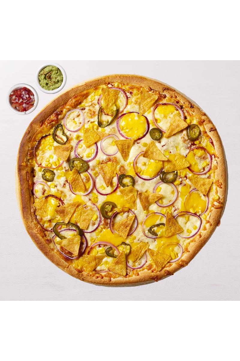Vegetarpizza med nachips, jalapenos, rødløk, mais og salsasaus. Toppet med cheddarost.