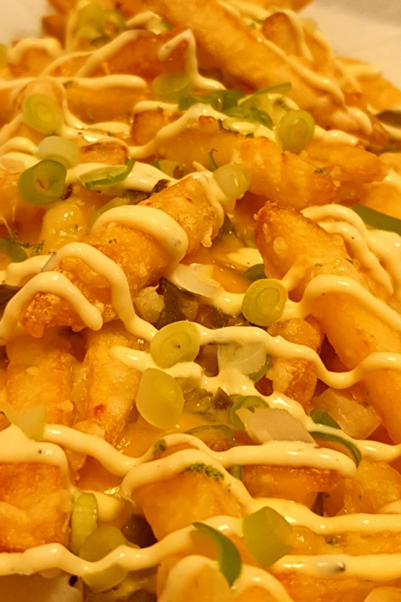 Pommes Frites med ost, jalapenos, løk, chilisalt og aioli